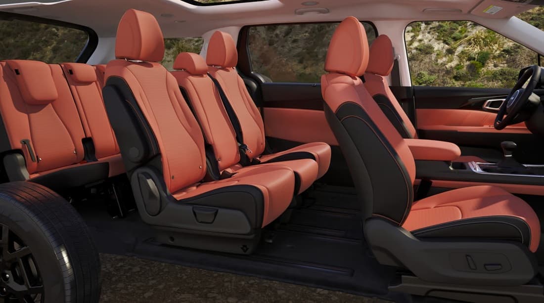 - Refined and sophisticated, the new Kia Carnival interior resembles a corporate jet inside. Slide-Flex seating for up to 8-passengers allows multi-configurable layouts, including a middle-row sliding seat allowing the front passenger easy access to a person (or baby) sitting in the second row. It can later convert to a functional table.