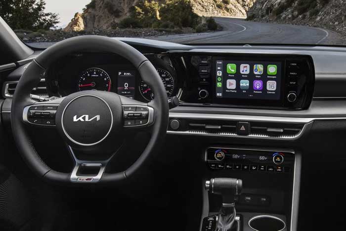 the new Kia K5 is a front-driving five-passenger sedan perfectly at home