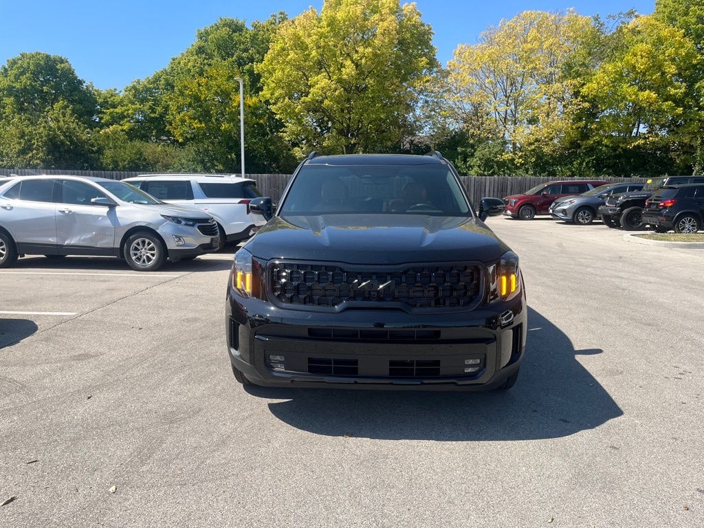 This Telluride is well equipped with Terracotta Interior Color Package, Telluride SX X-Line, 4D Sport Utility, 3.8L V6 DOHC, 8-Speed Automatic, AWD, Ebony Black, Black Leather, 10 Speakers, 3rd row seats: split-bench, 4-Wheel Disc Brakes, ABS brakes, Air Conditioning, Alloy wheels, AM/FM radio: SiriusXM, Apple CarPlay & Android Auto, Auto High-beam Headlights, Auto-dimming Rear-View mirror, Auto-leveling suspension, Automatic temperature control, Brake assist, Bumpers: body-color, Compass, Delay-off headlights, Driver door bin, Driver vanity mirror, Dual front impact airbags, Dual front side impact airbags, Electronic Stability Control, Emergency communication system: 911 Connect, Exterior Parking Camera Rear, Four wheel independent suspension, Front anti-roll bar, Front Bucket Seats, Front Center Armrest, Front dual zone A/C, Front fog lights, Front reading lights, Fully automatic headlights, Garage door transmitter: HomeLink, harman/kardon® Speakers, Heated & Ventilated Front Bucket Seats, Heated door mirrors, Heated front seats, Heated steering wheel, Illuminated entry, Knee airbag, Leather Seat Trim, Leather Shift Knob, Leather steering wheel, Low tire pressure warning, Memory seat, Navigation System, Occupant sensing airbag, Outside temperature display, Overhead airbag, Overhead console, Panic alarm, Passenger door bin, Passenger vanity mirror, Power door mirrors, Power driver seat, Power Liftgate, Power moonroof, Power passenger seat, Power steering, Power windows, Radio data system, Radio: AM/FM Harman Kardon Audio System, Rear air conditioning, Rear anti-roll bar, Rear audio controls, Rear reading lights, Rear side impact airbag, Rear window defroster, Rear window wiper, Reclining 3rd row seat, Remote keyless entry, Security system, Speed control, Speed-sensing steering, Split folding rear seat, Spoiler, Steering wheel mounted audio controls, Tachometer, Telescoping steering wheel, Tilt steering wheel, Traction control, Trip computer, Turn signal indicator mirrors, Variably intermittent wipers, Ventilated front seats, and Wheels: 20" x 7.5" Black Finish X-LINE Exclusive.