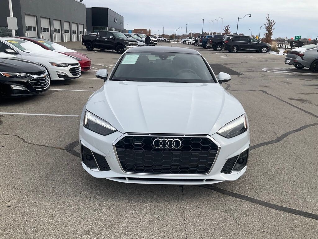 This A5 Sportback is well equipped with Convenience Package, Premium Plus (2 Rear USB Charge Ports, Audi Virtual Cockpit Plus, Bang & Olufsen Sound System w/3D Sound, Leatherette Covered Center Console & Door Armrests, Power Folding Exterior Mirrors, Top View Camera System, and Wireless Phone Charging Pad), A5 Sportback 45 S line Premium Plus quattro, 4D Hatchback, 2.0L 4-Cylinder TFSI, 7-Speed Automatic S tronic, quattro, Glacier White Metallic, Black w/Leather Seating Surfaces, Power Liftgate, 10 Speakers, 4-Wheel Disc Brakes, ABS brakes, Air Conditioning, Alloy wheels, AM/FM radio, Anti-whiplash front head restraints, Auto High-beam Headlights, Auto-dimming Rear-View mirror, Automatic temperature control, Brake assist, Bumpers: body-color, Compass, Delay-off headlights, Driver door bin, Driver vanity mirror, Dual front impact airbags, Dual front side impact airbags, Electronic Stability Control, Emergency communication system: Audi connect CARE, Exterior Parking Camera Rear, Four wheel independent suspension, Front anti-roll bar, Front Bucket Seats, Front Center Armrest, Front dual zone A/C, Front fog lights, Front reading lights, Garage door transmitter: HomeLink, Genuine wood console insert, Genuine wood dashboard insert, Genuine wood door panel insert, Heated door mirrors, Heated front seats, Heated Front Sport Seats, Heated steering wheel, Illuminated entry, Knee airbag, Leather Seating Surfaces, Leather Shift Knob, Leather steering wheel, Low tire pressure warning, Occupant sensing airbag, Outside temperature display, Overhead airbag, Overhead console, Panic alarm, Passenger door bin, Passenger vanity mirror, Power adjustable front head restraints, Power door mirrors, Power driver seat, Power moonroof, Power passenger seat, Power steering, Power windows, Radio data system, Radio: Audi Sound System, Rain sensing wipers, Rear air conditioning, Rear anti-roll bar, Rear reading lights, Rear seat center armrest, Rear window defroster, Remote keyless entry, Speed control, Speed-sensing steering, Speed-Sensitive Wipers, Split folding rear seat, Steering wheel mounted audio controls, Tachometer, Telescoping steering wheel, Tilt steering wheel, Traction control, Trip computer, Turn signal indicator mirrors, Variably intermittent wipers, and Wheels: 18" 5-Double-Spoke Design.