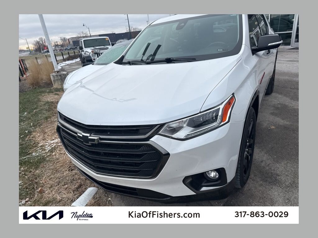 This Traverse is well equipped with Preferred Equipment Group 1LZ, Redline Edition (Black Door Handles, Dual SkyScape 2-Panel Power Sunroof, Ornamentation, and Wheels: 20" Gloss Black Painted Alum w/Red Stripes), Trailering Equipment (Heavy-Duty Cooling System), Floor Liner Package (LPO) (1st & 2nd Row All-Weather Floor Liner (LPO) and 3rd Row All-Weather Floor Liner (LPO)), Traverse Premier, 4D Sport Utility, 3.6L V6 SIDI VVT, 9-Speed Automatic, AWD, Iridescent Pearl Tricoat, Jet Black Leather, Bose Premium 10-Speaker Audio System Feature, Navigation System, Power Liftgate, 10 Speakers, 3.49 Axle Ratio, 3rd row seats: split-bench, 4-Wheel Disc Brakes, 7-Passenger Seating (2-2-3 Seating Configuration), ABS brakes, Air Conditioning, Alloy wheels, AM/FM radio: SiriusXM, Apple CarPlay/Android Auto, Auto High-beam Headlights, Auto-dimming door mirrors, Auto-dimming Rear-View mirror, Automatic temperature control, Brake assist, Bumpers: body-color, Compass, Delay-off headlights, Driver door bin, Driver vanity mirror, Dual front impact airbags, Dual front side impact airbags, Electronic Stability Control, Emergency communication system: OnStar Guidance, Four wheel independent suspension, Front anti-roll bar, Front Bucket Seats, Front Center Armrest, Front dual zone A/C, Front fog lights, Front reading lights, Fully automatic headlights, Garage door transmitter, Heated door mirrors, Heated front seats, Heated rear seats, Heated steering wheel, Illuminated entry, Low tire pressure warning, Memory seat, Occupant sensing airbag, Outside temperature display, Overhead airbag, Overhead console, Panic alarm, Passenger door bin, Passenger vanity mirror, Perforated Leather-Appointed Seat Trim, Power door mirrors, Power driver seat, Power passenger seat, Power steering, Power windows, Premium audio system: Chevrolet MyLink, Radio data system, Radio: Chevrolet MyLink AM/FM Stereo w/Navigation, Rear air conditioning, Rear anti-roll bar, Rear reading lights, Rear window defroster, Rear window wiper, Remote keyless entry, Roof rack: rails only, Security system, SiriusXM Satellite Radio, Speed control, Speed-sensing steering, Spoiler, Steering wheel memory, Steering wheel mounted audio controls, Tachometer, Telescoping steering wheel, Tilt steering wheel, Traction control, Trip computer, Turn signal indicator mirrors, Variably intermittent wipers, Ventilated front seats, Voltmeter, Wheel Locks, and Wheels: 20" Argent Metallic Machine Faced Aluminum.