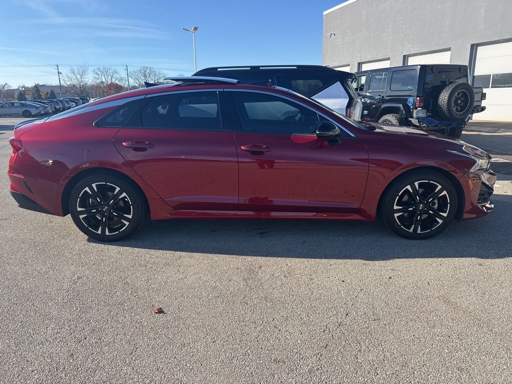This K5 is well equipped with GT-Line FWD Premium Package (Forward Collision Avoidance-Assist - Cyclist, Forward Collision Avoidance-Assist - Junction Turn, Gloss Black Pillar & Door Frame Cover, LED Interior Lighting, LED Projection Headlights, Panoramic Sunroof, Smart Cruise Control w/Stop & Go, and Wireless Charger), K5 GT-Line, 4D Sedan, 1.6L I4 DGI, 8-Speed Automatic, FWD, Passion Red, Black w/Leatherette Seat Trim, 4-Wheel Disc Brakes, 6 Speakers, ABS brakes, Air Conditioning, Alloy wheels, AM/FM radio, Apple CarPlay & Android Auto, Auto High-beam Headlights, Automatic temperature control, Brake assist, Bumpers: body-color, Carpeted Floor Mats, Cloth/Leatherette Seat Trim, Delay-off headlights, Driver door bin, Driver vanity mirror, Dual front impact airbags, Dual front side impact airbags, Electronic Stability Control, Four wheel independent suspension, Front anti-roll bar, Front Bucket Seats, Front Center Armrest, Front dual zone A/C, Front fog lights, Front reading lights, Fully automatic headlights, Heated door mirrors, Illuminated entry, Knee airbag, Low tire pressure warning, Occupant sensing airbag, Outside temperature display, Overhead airbag, Overhead console, Panic alarm, Passenger door bin, Passenger vanity mirror, Power door mirrors, Power driver seat, Power steering, Power windows, Radio data system, Radio: AM/FM/MP3 Audio System, Rear anti-roll bar, Rear seat center armrest, Rear side impact airbag, Rear window defroster, Remote keyless entry, Security system, Speed control, Speed-sensing steering, Split folding rear seat, Spoiler, Sport steering wheel, Steering wheel mounted audio controls, Tachometer, Telescoping steering wheel, Tilt steering wheel, Traction control, Trip computer, Turn signal indicator mirrors, Variably intermittent wipers, and Wheels: 7.5J x 18" Graphite Machined Finish Alloy.