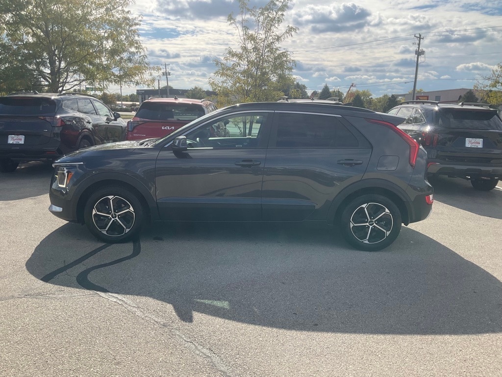 This Niro is well equipped with Niro EX, 4D Sport Utility, 1.6L I4 DGI Hybrid DOHC 16V LEV3-SULEV30, 6-Speed Automatic, FWD, Graphite Gray, Charcoal w/Cloth & Vegan Leather-Trimmed Seats, Navigation System, 4-Wheel Disc Brakes, 4.438 Axle Ratio, 6 Speakers, ABS brakes, Air Conditioning, Alloy wheels, AM/FM radio: SiriusXM, Apple CarPlay & Android Auto, Auto High-beam Headlights, Automatic temperature control, Brake assist, Bumpers: body-color, Cargo Net, Carpet Floor Mats, Cloth & Vegan Leather-Trimmed Seats, Delay-off headlights, Driver door bin, Driver vanity mirror, Dual front impact airbags, Dual front side impact airbags, Electronic Stability Control, Emergency communication system: Kia Connect (includes 1 year free trial), Exterior Parking Camera Rear, Four wheel independent suspension, Front anti-roll bar, Front Bucket Seats, Front Center Armrest, Front dual zone A/C, Front reading lights, Fully automatic headlights, Heated door mirrors, Heated Front Bucket Seats, Heated front seats, Illuminated entry, Knee airbag, Leather Shift Knob, Low tire pressure warning, Mud Guards, Occupant sensing airbag, Outside temperature display, Overhead airbag, Overhead console, Panic alarm, Passenger door bin, Passenger vanity mirror, Power door mirrors, Power driver seat, Power steering, Power windows, Radio: AM/FM/HD/SiriusXM, Rain sensing wipers, Rear anti-roll bar, Rear seat center armrest, Rear window defroster, Rear window wiper, Remote keyless entry, Security system, Smart Key w/ Push Button and Remote Start, Speed control, Speed-sensing steering, Split folding rear seat, Spoiler, Steering wheel mounted audio controls, Telescoping steering wheel, Tilt steering wheel, Traction control, Trip computer, Turn signal indicator mirrors, Variably intermittent wipers, and Wheels: 16" Alloy Aero.
