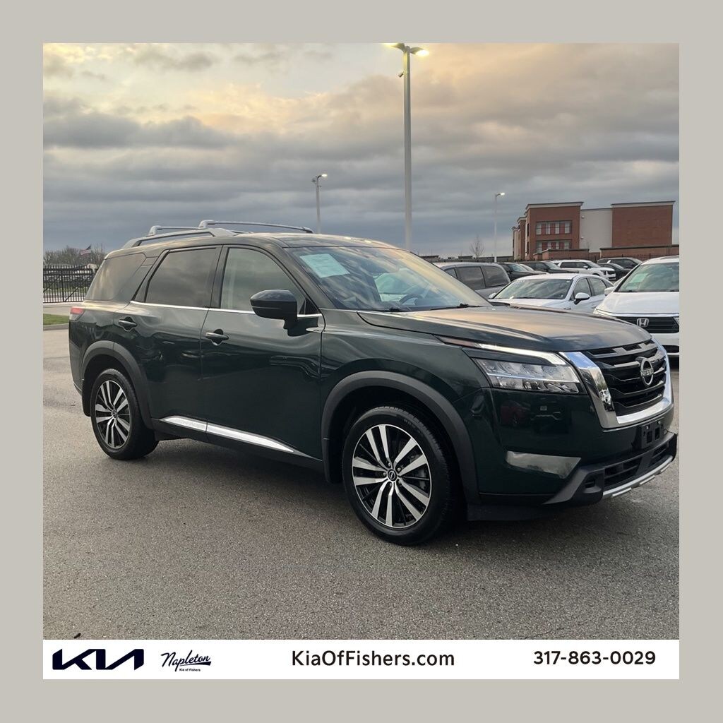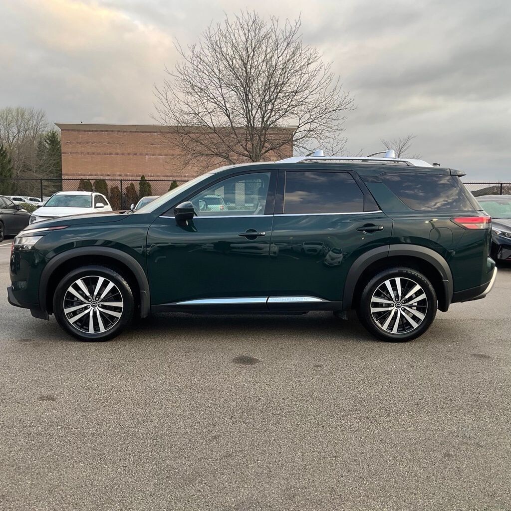 This Pathfinder is well equipped with Cargo Package (Cargo Area Protector, Cargo Net, and First Aid Kit), Platinum Captain Chairs Package (2nd-Row Captain Chairs and 2nd-Row Removable Center Console), Pathfinder Platinum, 4D Sport Utility, V6, 9-Speed Automatic, 4WD, Obsidian Green Pearl, Chestnut Leather, Bose Premium Audio System, Heads-Up Display, Navigation system: NissanConnect Navigation, Power Liftgate, Power moonroof, Wheels: 20" Machined Alloy w/Dark Met Gray Finish, 13 Speakers, 3rd row seats: bench, 4-Wheel Disc Brakes, ABS brakes, Air Conditioning, Alloy wheels, AM/FM radio: SiriusXM, Auto High-beam Headlights, Auto tilt-away steering wheel, Auto-dimming Rear-View mirror, Automatic temperature control, Axle Ratio: 4.334, Black Splash Guards (Set of 4), Bodyside moldings, Brake assist, Bumpers: body-color, Captain's Chairs Carpeted Floor Mats (Set of 4), Cross Bars, Delay-off headlights, Driver door bin, Driver vanity mirror, Dual front impact airbags, Dual front side impact airbags, Electronic Stability Control, Emergency communication system: NissanConnect Services, Exterior Parking Camera Rear, Four wheel independent suspension, Front anti-roll bar, Front Bucket Seats, Front Center Armrest, Front dual zone A/C, Front reading lights, Fully automatic headlights, Garage door transmitter: HomeLink, Heated & Cooled Front Bucket Seats, Heated door mirrors, Heated front seats, Heated rear seats, Heated steering wheel, Illuminated entry, Knee airbag, Leather steering wheel, Low tire pressure warning, Memory seat, NissanConnect w/Navigation & Services, Occupant sensing airbag, Outside temperature display, Overhead airbag, Overhead console, Panic alarm, Passenger door bin, Passenger vanity mirror, Power door mirrors, Power driver seat, Power passenger seat, Power steering, Power windows, Radio data system, Radio: AM/FM Audio System, Rain sensing wipers, Rear air conditioning, Rear anti-roll bar, Rear reading lights, Rear seat center armrest, Rear side impact airbag, Rear window defroster, Rear window wiper, Reclining 3rd row seat, Remote keyless entry, Security system, Semi-Aniline Leather Seating Surfaces, Speed control, Speed-sensing steering, Speed-Sensitive Wipers, Split folding rear seat, Spoiler, Steering wheel memory, Steering wheel mounted audio controls, Tachometer, Telescoping steering wheel, Tilt steering wheel, Traction control, Trip computer, Turn signal indicator mirrors, Variably intermittent wipers, and Ventilated front seats.